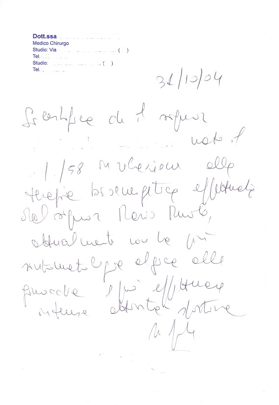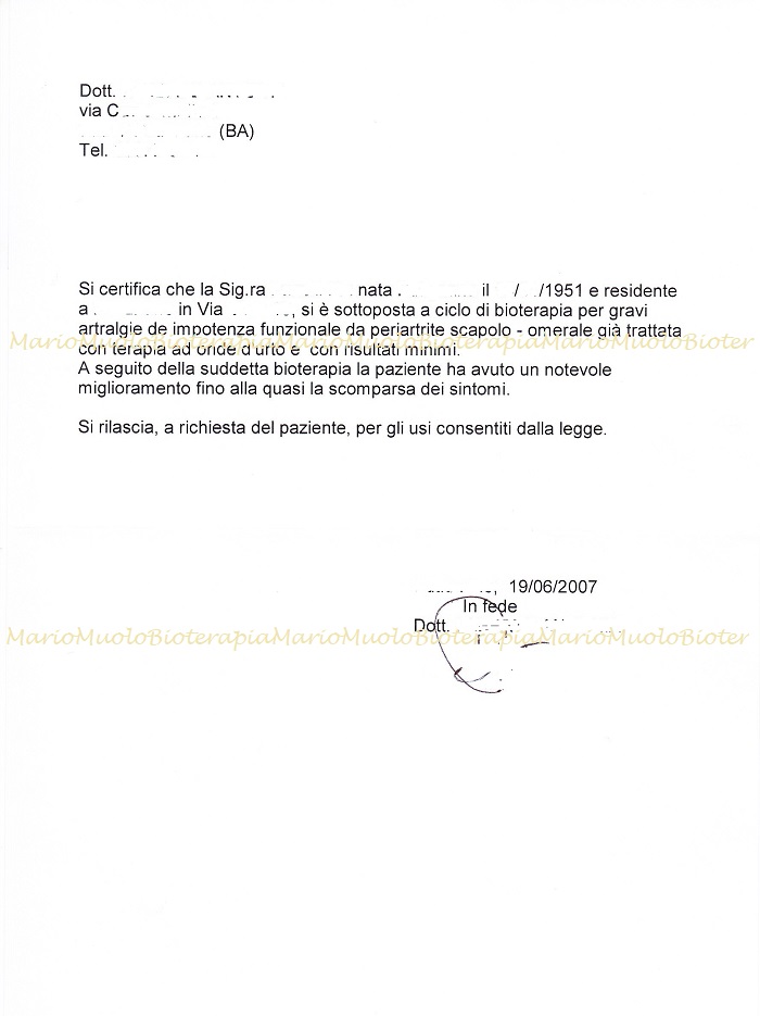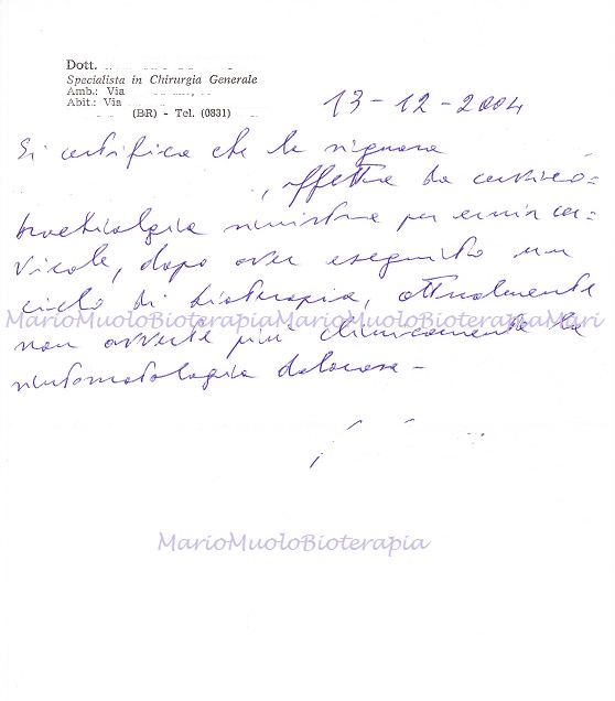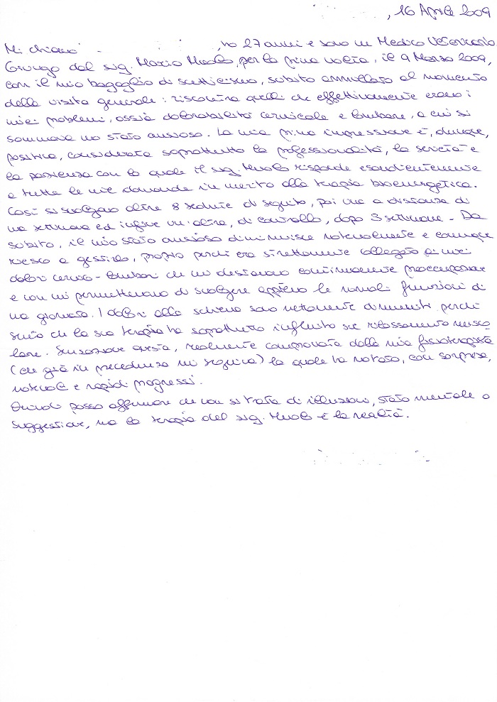Mi chiamo … … , ho 27 anni e sono un Medico Veterinario. Giungo dal sig. Mario Muolo, per la prima volta, il 9 Marzo 2009, con il mio bagaglio di scetticismo, subito annullato al momento della visita generale: riscontra quelli che effettivamente erano i miei problemi, ossia dolorabilità cervicale e lombare, a cui si sommava uno stato ansioso. La mia prima impressione è, dunque, positiva, considerata soprattutto la professionalità, la serietà e la pazienza con la quale il sig. Muolo risponde esaurientemente a tutte le mie domande in merito alla terapia bioenergetica. Così si svolgono altre 8 sedute di seguito, poi una a distanza di una settimana ed infine un’altra, di controllo, dopo 3 settimane. Da subito, il mio stato ansioso diminuisce notevolmente e comunque riesco a gestirlo, proprio perché era strettamente collegato ai miei dolori cervico – lombari che mi destavano continuamente preoccupazione e non mi permettevano di svolgere appieno le normali funzioni di una giornata. I dolori alla schiena sono nettamente diminuiti perché sento che la sua terapia ha soprattutto influito sul rilassamento muscolare. Sensazione questa, realmente comprovata dalla mia fisioterapista (che già in precedenza mi seguiva) la quale ha notato, con sorpresa, notevoli e rapidi progressi.