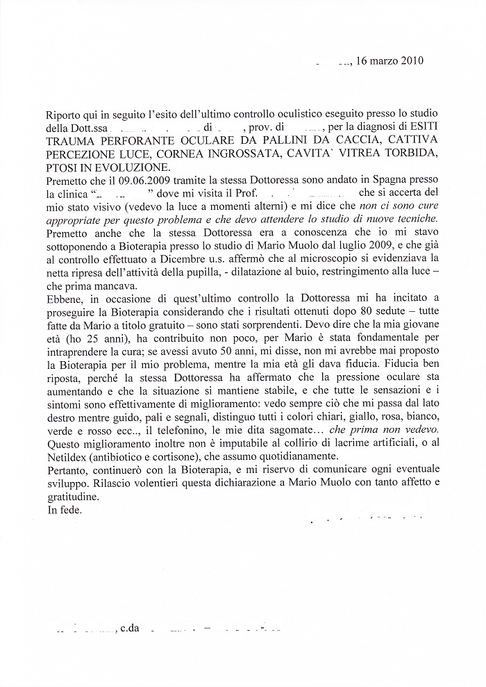 Premetto che il 09.06.2009 tramite la stessa Dottoressa sono andato in Spagna presso la clinica "... ... " dove mi visita il Prof. ... ... che si accerta del mio stato visivo (vedevo la luce a momenti alterni) e mi dice che non ci sono cure appropriate per questo problema e che devo attendere lo studio di nuove tecniche. Premetto anche che la stessa Dottoressa era a conoscenza che io mi stavo sottoponendo a Bioterapia presso lo studio di Mario Muolo dal luglio 2009, e che già al controllo effettuato a Dicembre u.s. affermò che al microscopio si evidenziava la netta ripresa dell'attività della pupilla, - dilatazione al buio, restringimento alla luce —che prima mancava.