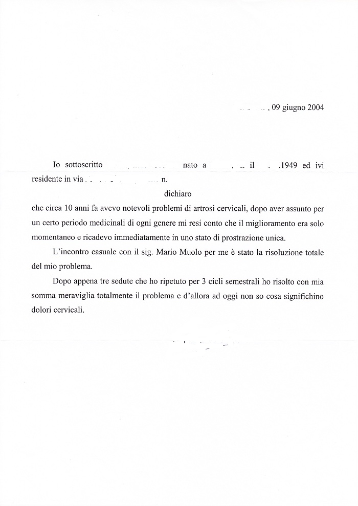 Dopo appena tre sedute che ho ripetuto per 3 cicli semestrali ho risolto con mia somma meraviglia totalmente il problema e d'allora ad oggi non so cosa significhino dolori cervicali.
