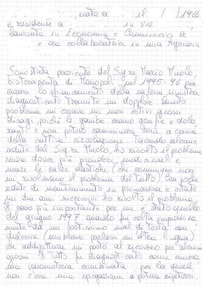 Sono stata paziente del Sig. Mario Muolo bioterapeuta di Monopoli nel 1995-96 per curare lo sfiancamento della safena sinistra diagnosticato tramite doppler. Questo problema mi creava nei mesi estivi grossi disagi, poiché le gambe erano gonfie e doloranti e non potevo camminare bene a causa della cattiva circolazione. Facendo alcune sedute dal Sig. Muolo, ho risolto il problema senza dover più prendere medicinali e usare le calze elastiche (che comunque non mi risolvevano il problema del tutto). Con poche sedute di mantenimento in primavera e estate nei due anni successivi ho risolto il problema.