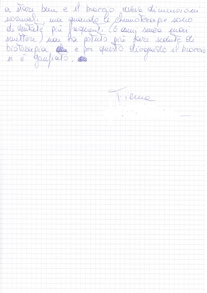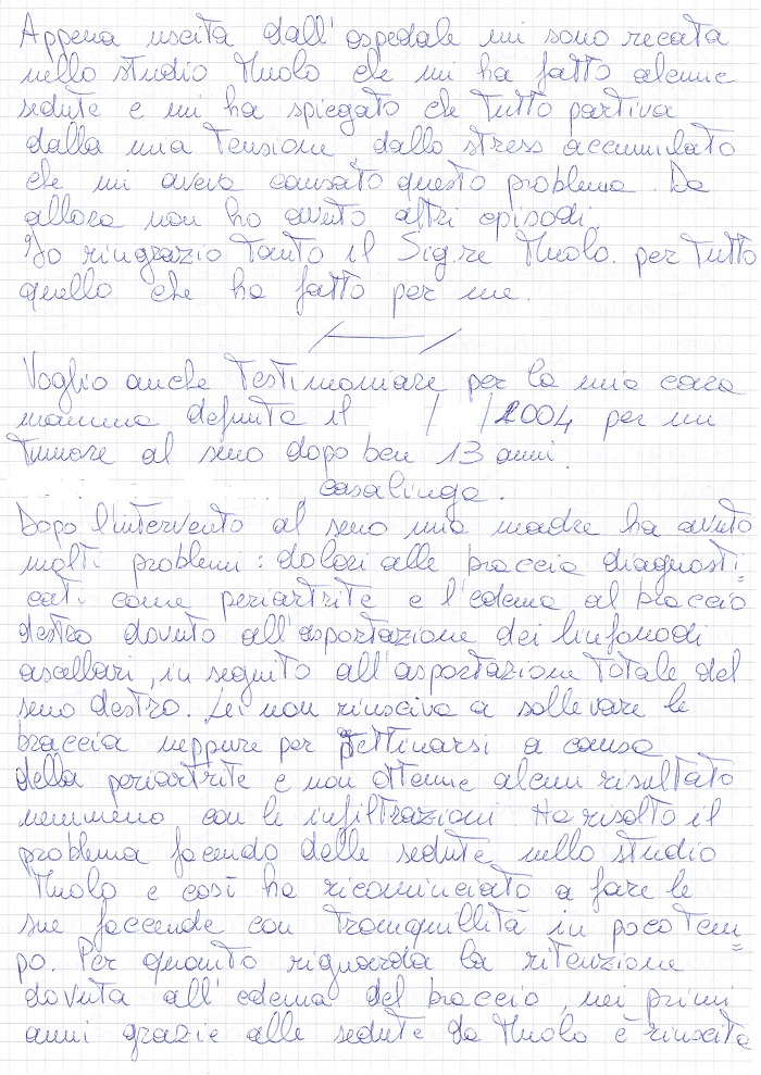 Dopo l’intervento al seno mia madre ha avuto molti problemi: dolori alle braccia diagnosticati come periartrite e l’edema al braccio destro dovuto all’asportazione dei linfonodi ascellari, in seguito all’asportazione totale del seno destro. Lei non riusciva a sollevare le braccia neppure per pettinarsi a causa della periartrite e non ottenne alcun risultato nemmeno con le infiltrazioni. Ha risolto il problema facendo delle sedute nello studio Muolo e così ha ricominciato a fare le sue faccende con tranquillità in poco tempo. Per quanto riguarda la ritenzione dovuta all’edema del braccio, nei primi anni grazie alle sedute da Muolo è riuscita a stare bene e il braccio aveva dimensioni normali, ma quando le chemioterapie sono diventate più frequenti (6 anni senza mai smettere) non ha potuto più fare sedute di bioterapia e per questo il braccio si è gonfiato.