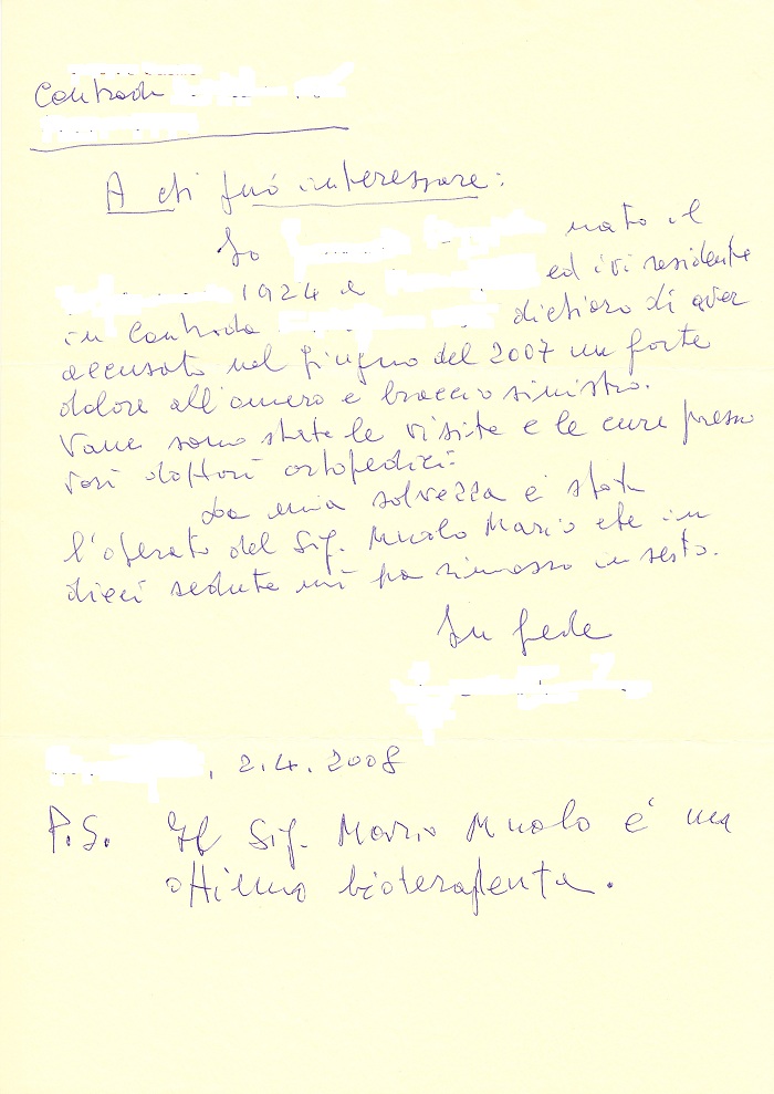 Io … … nato il … … 1924 a … … ed ivi residente in Contrada … … dichiaro di aver accusato nel Giugno del 2007 un forte dolore all’omero e braccio sinistro.