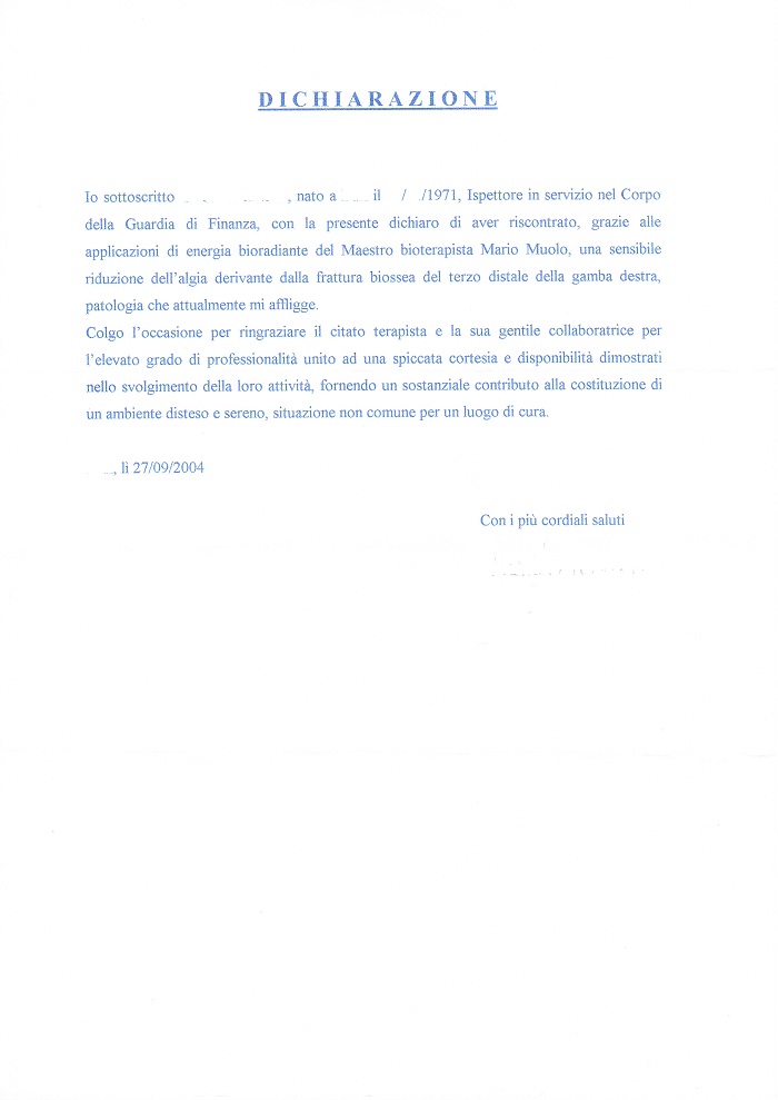 Come sempre accade, la necessità spinge anche i più scettici ad avvicinarsi a pratiche poco conosciute o descritte dal volgo in maniera così romanzesche da apparire singolari o straordinarie e quindi inverosimili. Tale era la mia convinzione prima di avere diretta esperienza della bio-terapia e in particolare prima di aver conosciuto il sig. Mario Muolo che certamente non indossava i panni del mago medioevale ma semplicemente quelli di un " amico" dotato di qualcosa che agli incompetenti sfugge, a cui chiedere aiuto e riporre in lui la massima fiducia.