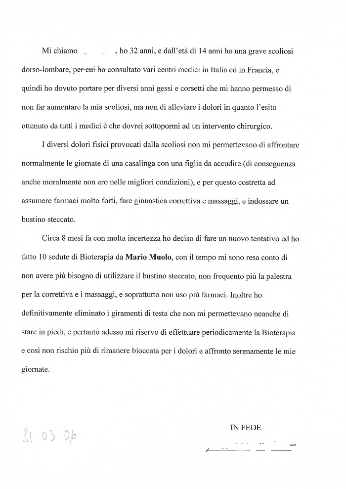 Nel corso dell'anno 1993 mi è stata diagnosticata una Fistola Sacrococcigea per la cura della quale era necessario un intervento chirurgico il cui decorso post-operatorio sarebbe stato relativamente lungo (circa 3 mesi). Mi sono quindi rivolto al Sig. Muolo che mi ha proposto una terapia di tipo bio-terapeutico. II risultato è stato che dopo una prima serie di sedute i sintomi infiammatori si sono notevolmente ridotti fino a scomparire totalmente nei dieci giorni successivi la fine della terapia.