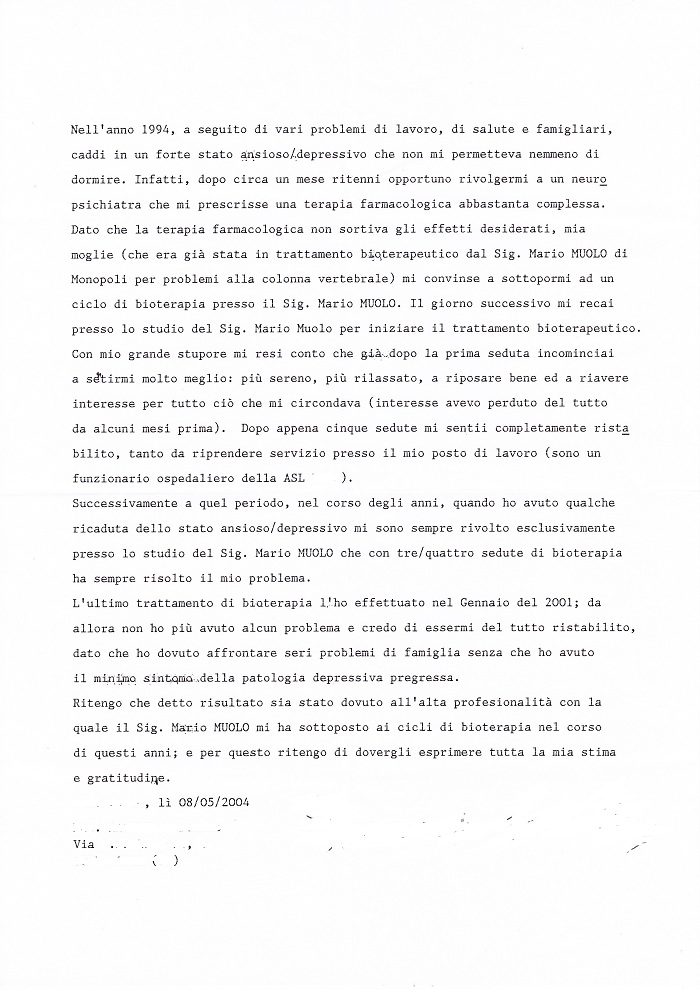 Nell'anno 1994, a seguito di vari problemi di lavoro, di salute e famigliari, caddi in un forte stato asioso/depressivo che non mi permetteva nemmeno di dormire. Infatti, dopo circa un mese ritenni opportuno rivolgermi a un neuropsichiatra che mi prescrisse una terapia farmacologica abbastanza complessa. Dato che la terapia farmacologica non sortiva gli effetti desiderati, mia moglie (che era già stata in trattamento bloterapeutico dal Sig. Mario MUOLO di Monopoli per problemi alla colonna vertebrale) mi convinse a sottopormi ad un ciclo di bioterapia presso il Sig. Mario MUOLO. Il giorno successivo mi recai presso lo studio del Sig. Mario Muolo per iniziare il trattamento bioterapeutico. Con mio grande stupore mi resi conto che già dopo la príma seduta incominciai a sentirmi molto meglio: più sereno, più rilassato, a riposare bene ed a riavere interesse per tutto ciò che mi circondava (interesse avevo perduto del tutto da alcuni mesi prima). Dopo appena cinque sedute mi sentii completamente ristabilito, tanto da riprendere servizio presso il mio posto di lavoro (sono un