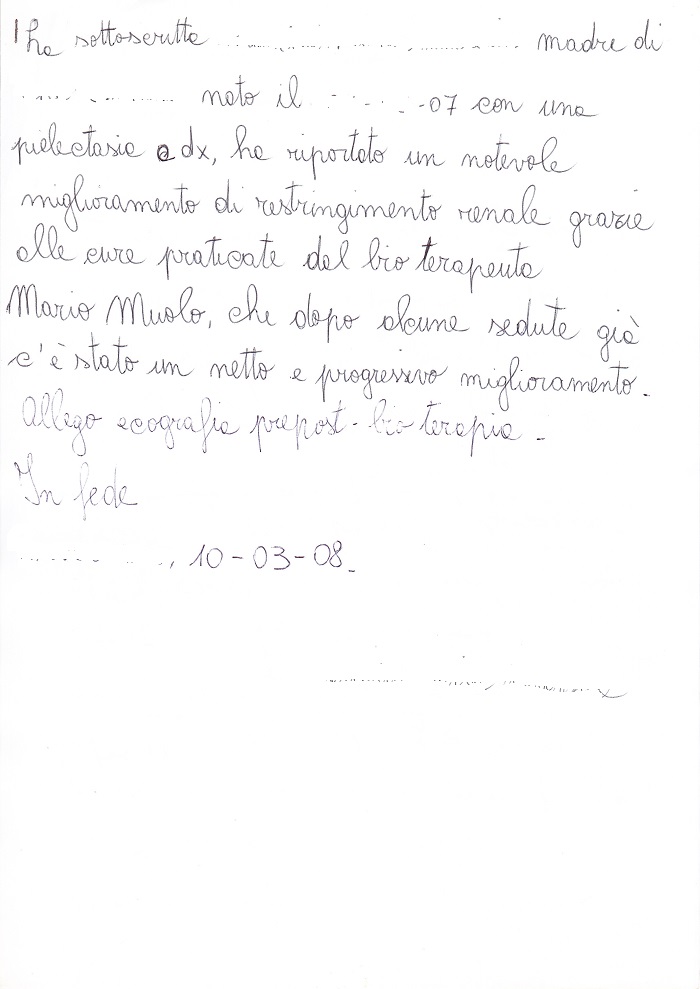La sottoscritta … … … madre di … … … nato il … -  … - 07 con una pielectasia a dx, ha riportato un notevole miglioramento di restringimento renale grazie alle cure praticate dal bioterapeuta Mario Muolo, che dopo alcune sedute già c’è stato un netto e progressivo miglioramento.