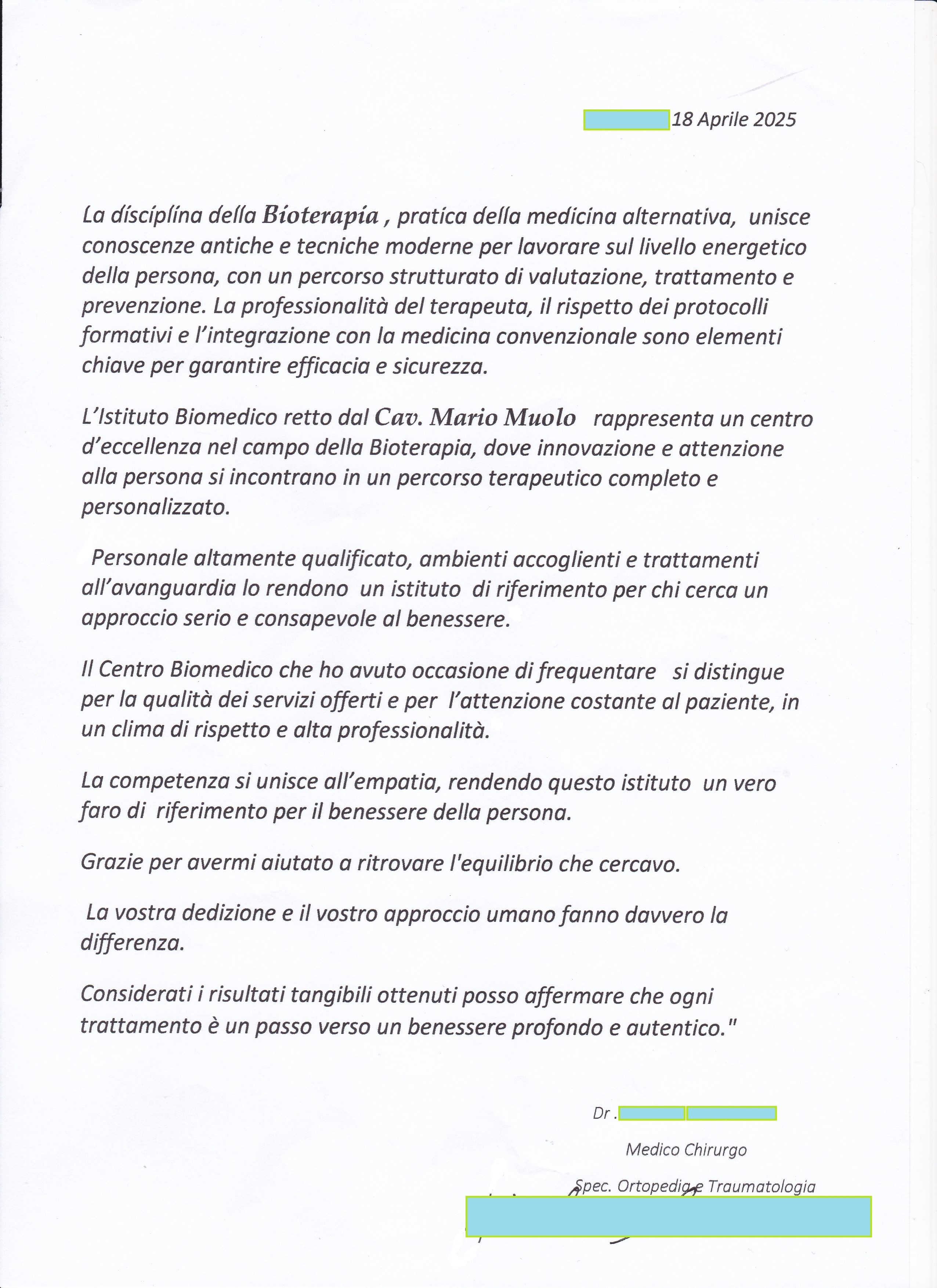L'lstituto Biomedico retto dal Cav. Mario Muolo rappresenta un centro d'eccellenza nel campo della Bioterapia, dove innovazione e attenzione alla persona si incontrano in un percorso terapeutico completo e personalizzato.