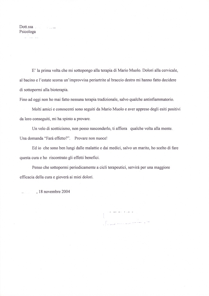 E' la prima volta che mi sottopongo alla terapia di Mario Muolo. Dolori alla cervicale, al bacino e l'estate scorsa un'improvvisa periartrite al braccio destro mi hanno fatto decidere di sottopormi alla bioterapia.