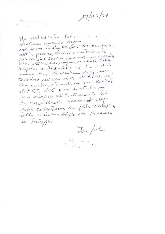 nel mese di luglio 2006 mi comparve, all’improvviso, dolore e contrattura a livello del rachide cervicale con irradiazione all’angolo infero mediale della scapola e parestesie al 2 e 3 dito mano sin. La sintomatologia non recedeva né con ciclo di FANS, né con corticosteroidi, né con sedute di FKT. Nel mese di ottobre mi sono sottoposto al trattamento del Sig. Mario Muolo, ricavando dopo sette sedute una completa risoluzione della sintomatologia che permane a tutt’oggi.