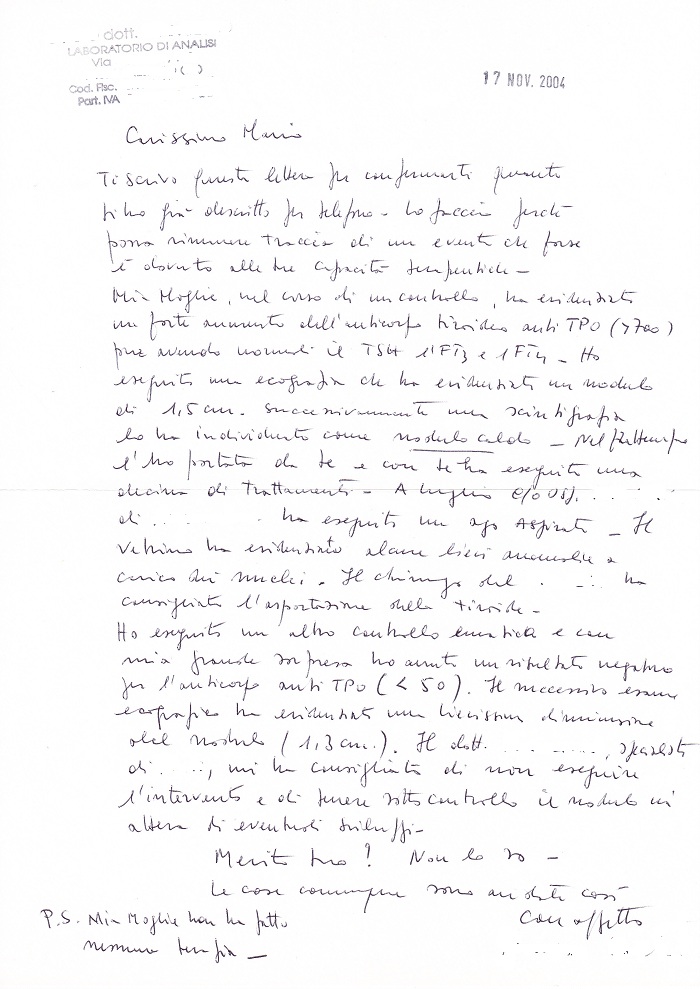 Mia moglie, nel corso di un controllo, ha evidenziato un forte aumento dell’anticorpo tiroideo anti TPO (+700) pur avendo normali il TSH l’FT3 E l’FT4. Ho eseguito una ecografia che ha evidenziato un nodulo di 1,5 cm. Successivamente una scintigrafia lo ha individuato come nodulo caldo. Nel frattempo l’ho portata da te e con te ha eseguito una decina di trattamenti. A Luglio c/o Osp. …. di … ha eseguito un ago aspirato. Il vetrino ha evidenziato alcune lievi anomalie a carico dei nuclei. Il chirurgo del … ha consigliato l’asportazione della tiroide.