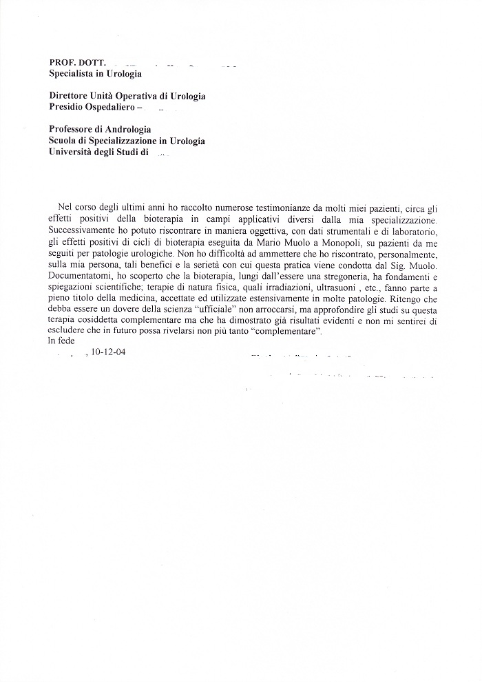Nel corso degli ultimi anni ho raccolto numerose testimonianze da molti miei pazienti, circa gli effetti positivi della bioterapia in campi applicativi diversi dalla mia specializzazione. Successivamente ho potuto riscontrare in maniera oggettiva, con dati strumentali e di laboratorio, gli effetti positivi di cicli di bioterapia eseguita da Mario Muolo a Monopoli, su pazienti da me seguiti per patologie urologiche. Non ho difficoltà ad ammettere che ho riscontrato, personalmente, sulla mia persona, tali benefici e la serietà con cui questa pratica viene condotta dal Sig. Muolo. Documentatomi, ho scoperto che la bioterapia, lungi dall'essere una stregoneria, ha fondamenti e spiegazioni scientifiche; terapie di natura fisica, quali irradiazioni, ultrasuoni , etc., fanno parte a pieno titolo della medicina, accettate ed utilizzate estensivamente in molte patologie. Ritengo che debba essere un dovere della scienza "ufficiale" non arroccarsi, ma approfondire gli studi su questa terapia cosiddetta complementare ma che ha dimostrato già risultati evidenti e non mi sentirei di escludere che in futuro possa rivelarsi non più tanto "complementare".