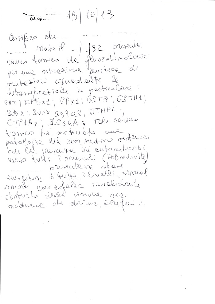 Certifico che … … nato il ../../92 presenta carico tossico da fluorchinolonici per una situazione genetica di mutazioni riguardanti la detossificazione, in particolare: CAT; EPHx1; GPx1; GSTP1; GSTM1; SOD2; SUOX 9370S; MTHFR; CYP1A2; SLC64A. Tale carico tossico ha scatenato una patologia del connettivo sistemico con la presenza di autoanticorpi verso tutti i muscoli (polimiosite).