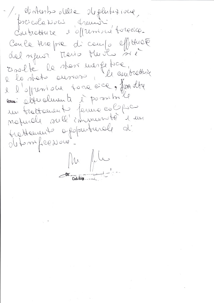 Con la terapia di campo effettuata dal signor Mario Muolo si è risolta la stasi energetica e lo stato ansioso, le contratture e l’oppressione toracica. Inoltre attualmente è possibile un trattamento farmacologico naturale sull’immunità e un trattamento agopunturale di detossificazione.