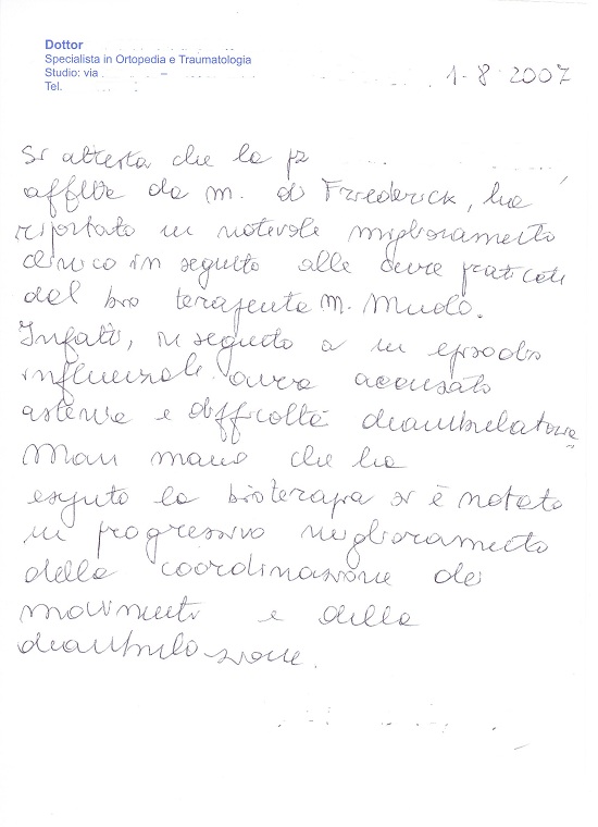 Si attesta che la pz. … … affetta da Morbo di Friederick, ha riportato un notevole miglioramento clinico in seguito alle cure praticate dal bio terapeuta M. Muolo.
