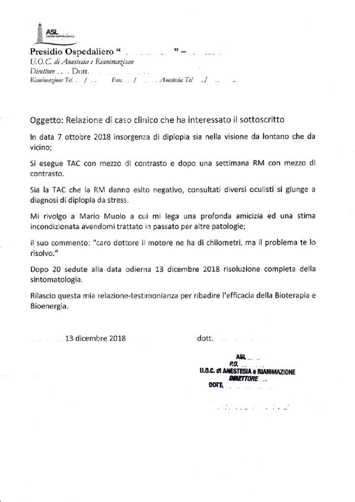 Rilascio questa mia relazione-testimonianza per ribadire I'efficacia della Bioterapia e Bioenergia.