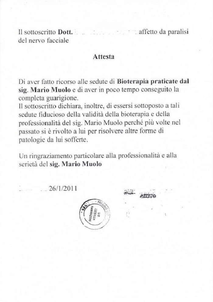 Di aver fatto ricorso alle sedute di Bioterapia praticate dal sig. Mario Muolo e di aver in poco tempo conseguito la completa guarigione. Il sottoscritto dichiara, inoltre, di essersi sottoposto a tali sedute fiducioso della validità della bioterapia e della professionalità del sig. Mario Muolo perché più volte nel passato si è rivolto a lui per risolvere altre forme di patologie da lui sofferte.