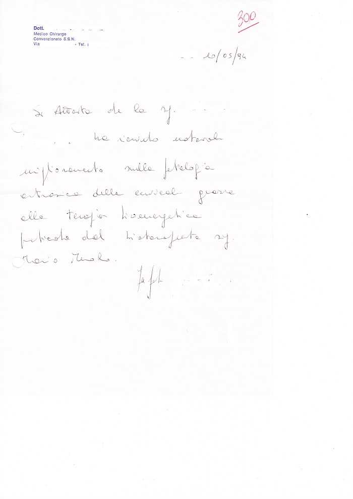 Si Attesta che la Sig. … …. ha ricevuto notevole miglioramento sulla patologia artrosica della cervicale grazie alla terapia bioenergetica praticata dal bioterapeuta sig. Mario Muolo.