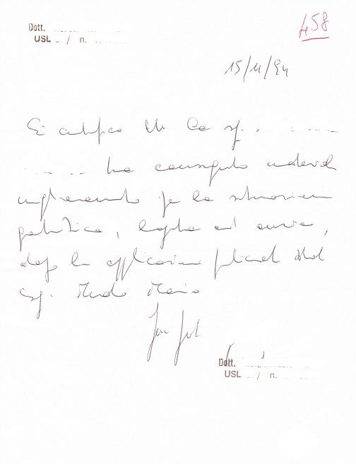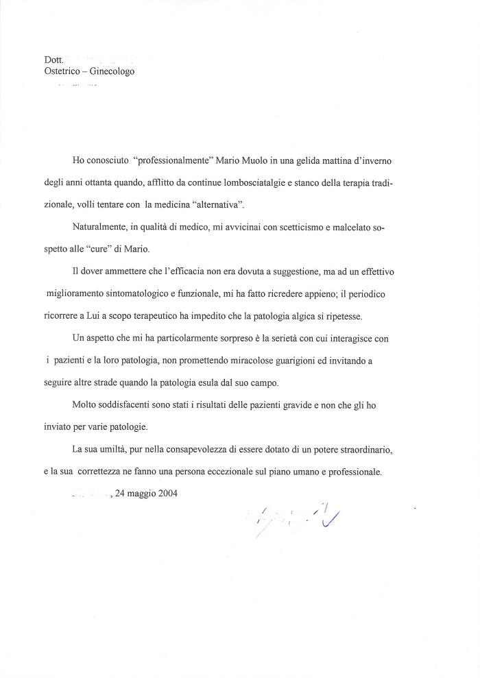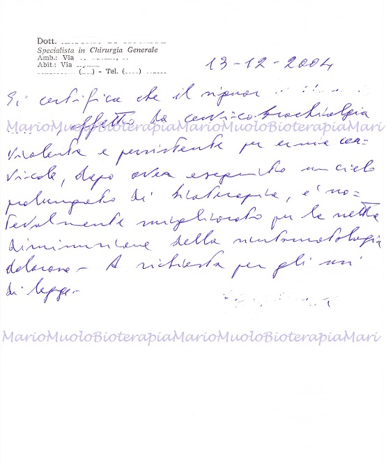 Si certifica che il signor … … … , affetto da cervicobrachialgia violenta e persistente per ernia cervicale, dopo aver eseguito un ciclo prolungato di bioterapia, è notevolmente migliorato per la netta diminuzione della sintomatologia dolorosa. A richiesta per gli usi di legge.