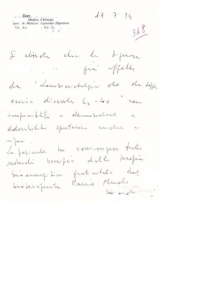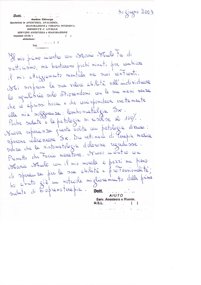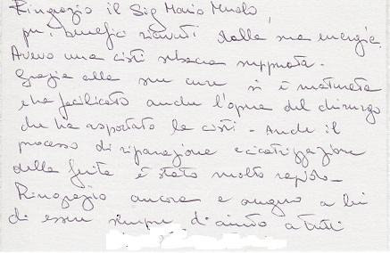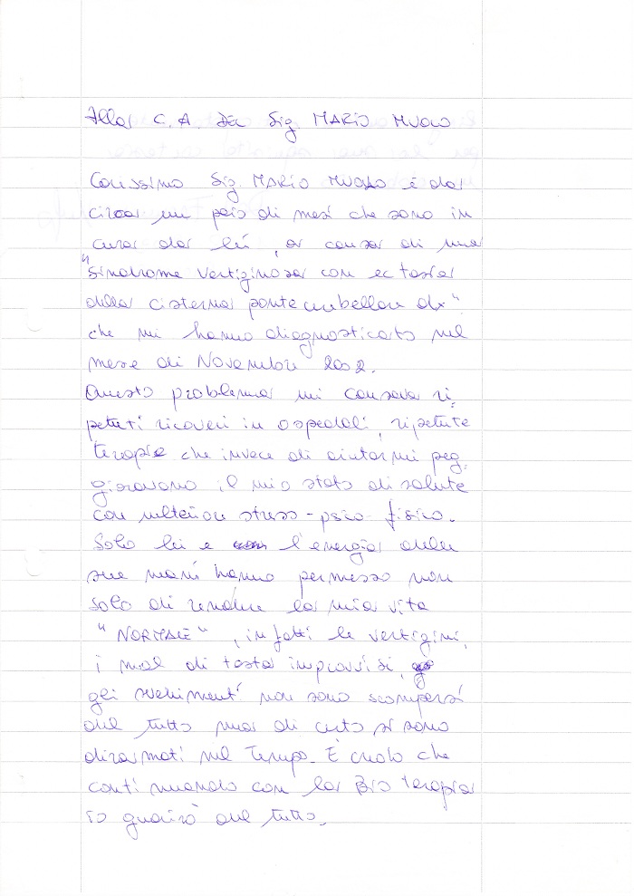Ringrazio il Sig. Mario Muolo, per i benefici ricevuti dalla sua energia. Avevo una cisti sebacea suppurata. Grazie alle sue cure si è maturata e ha facilitato anche l’opera del chirurgo che ha asportato la cisti. Anche il processo di riparazione e cicatrizzazione della ferita è stato molto rapido. Ringrazio ancora e auguro a lui di essere sempre di aiuto a tutti. … … …