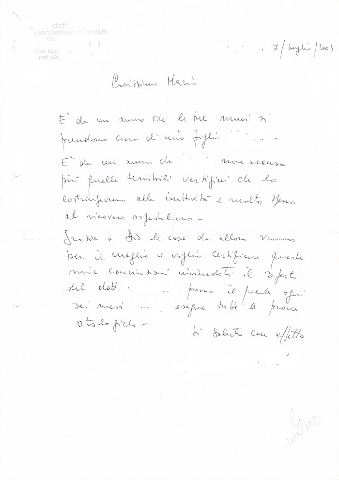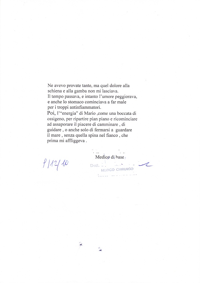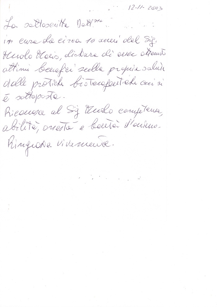 La sottoscritta Dott.ssa … … … in cura da circa 15 anni da Sig. Muolo Mario, dichiara di aver ottenuto ottimi benefici sulla propria salute dalle pratiche bioterapeutiche cui si è sottoposta.