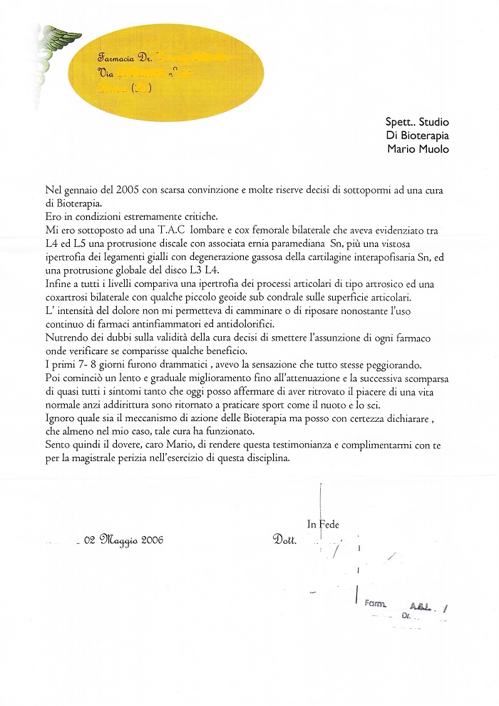 Si certifica che il sottoscritto Dott. … … dal 15.03.1995 si è sottoposto ad un ciclo di sedute di Bioterapia presso lo Studio del Bioterapeuta Sig. Mario Muolo, in Monopoli (Ba).