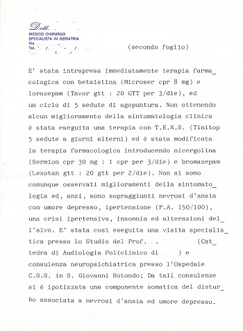 E' stata intrapresa immediatamente terapia farmacologica con betaistina (Microser cpr 8 mg) e lorazepam (Tavor gtt : 20 GTT per 3/die), ed un ciclo di 5 sedute di agopuntura. Non ottenendo alcun miglioramento della sintomatologia clinica è stata eseguita una terapia con T.E.N.S. (Tinitop 5 sedute a giorni alterni) ed è stata modificata la terapia farmacologica introducendo nicergolina (Sermion cpr 30 mg : 1 cpr per 3/die) e bromazepam (Lexotan gtt : 20 gtt per 2/die). Non si sono comunque osservati miglioramenti della sintomatologia ed, anzi, sono sopraggiunti nevrosi d'ansia con umore depresso, ipertensione (P.A. 150/100), una crisi ipertensiva, insonnia ed alterazioni dell'alvo. E' stata così eseguita una visita specialistica presso lo Studio del Prof. … … (Cattedra di Audiologia Policlinico di … …) e consulenza neuropsichiatrica presso l'Ospedale C.S.S. in S. Giovanni Rotondo; Da tali consulenze si è ipotizzata una componente somatica del disturbo associata a nevrosi d'ansia ed umore depresso.