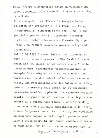 Dal 15.03.1995 è stato iniziato un ciclo di sedute di bioterapia presso lo Studio del Bioterapenta Sig. M. Muolo. E' da notare che già dalle prime sedute, sospendendo progressivamente la terapia farmacologica in atto, si è avuta una normalizzazione dei valori della pressione arteriosa, una regolarizzazione dell'alvo ed un notevole miglioramento dell'umore. E' da escludere un eventuale effetto placebo o componente emotiva legata a suggestione del sottoscritto. Dopo altre sedute si è quindi modificato il carattere dell'acufene, che è divenuto discontinuo e di intensità e frequenza variabile. Intanto, per escludere un processo espansivo dell'angolo ponto cerebellare è stata eseguita una T.A.C. cranio con mezzo di contrasto, che ha dato esito negativo. Ora, a