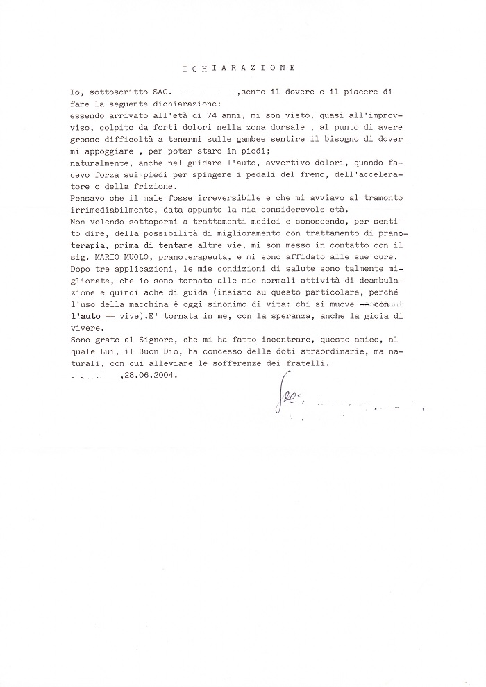 Non volendo sottopormi a trattamenti medici e conoscendo, per sentito dire, della possibilità di miglioramento con trattamento di pranoterapia, prima di tentare altre vie, mi son messo in contatto con il sig. MARIO MUOLO, pranoterapeuta, e mi sono affidato alle sue cure. Dopo tre applicazioni, le mie condizioni di salute sono talmente migliorate, che io sono tornato alle mie normali attività di deambulazione e quindi anche di guida (insisto su questo particolare, perché l'uso della macchina é oggi sinonimo di vita: chi si muove -- con l'auto -- vive). E' tornata in me, con la speranza, anche la gioia di vivere.