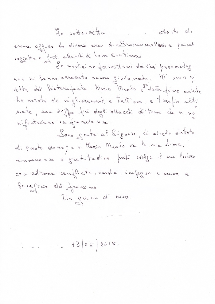 Le medicine prescrittemi dai vari pneumologi non mi hanno arrecato nessun giovamento. Mi sono rivolta dal bioterapeuta Mario Muolo e già dalle prime sedute ho notato dei miglioramenti e tutt’ora, a terapia ultimata, non soffro più degli attacchi di tosse che si manifestavano in precedenza.