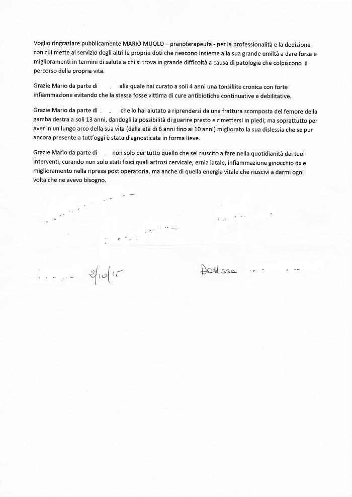 Voglio ringraziare pubblicamente MARIO MUOLO - pranoterapeuta - per la professionalità e la dedizione con cui mette al servizio degli altri le proprie doti che riescono insieme alla sua grande umiltà a dare forza e miglioramenti in termini di salute a chi si trova in grande difficoltà a causa di patologie che colpiscono il percorso della propria vita.
