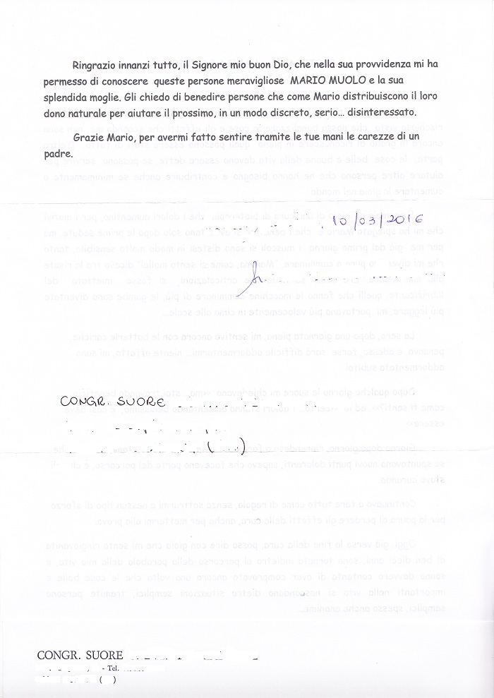 Ringrazio innanzi tutto, il Signore mio buon Dio, che nella sua provvidenza mi ha permesso di conoscere queste persone meravigliose MARIO MUOLO e la sua splendida moglie. Gli chiedo di benedire persone che come Mario distribuiscono il loro dono naturale per aiutare il prossimo, in un modo discreto, serio... disinteressato.