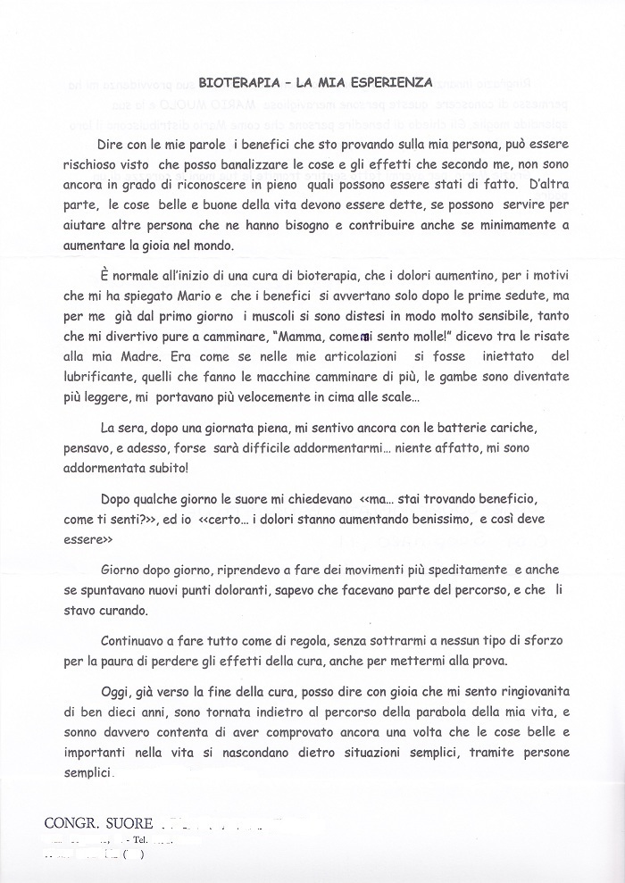 È normale all'inizio di una cura di bioterapia, che i dolori aumentino, per i motivi che mi ha spiegato Mario e che i benefici si avvertano solo dopo le prime sedute, ma per me già dal primo giorno i muscoli si sono distesi in modo molto sensibile, tanto che mi divertivo pure a camminare, "Mamma, come mi sento molle!" dicevo tra le risate alla mia Madre. Era come se nelle mie articolazioni si fosse iniettato del lubrificante, quelli che fanno le macchine camminare di più, le gambe sono diventate più leggere, mi portavano più velocemente in cima alle scale...
