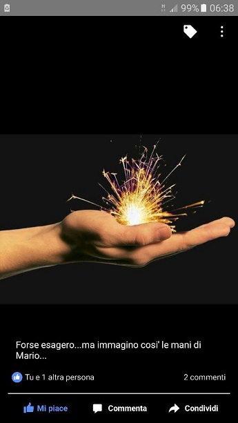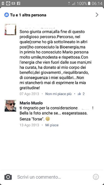 "Sono giunta ormai alla fine di questo prodigioso percorso. Percorso, nel quale (come ho già sottolineato in altri post) ho conosciuto la Bioenergia, ma in primis ho conosciuto Mario persona molto umile, modesta e rispettosa. Con l'energia che vien fuori dalle sue mani, mi ha curata, ha donato al mio corpo dei benefici, dei giovamenti, riequilibrando, di conseguenza i miei squilibri ... Non mi stancherò mai di esprimere la mia gratitudine!"