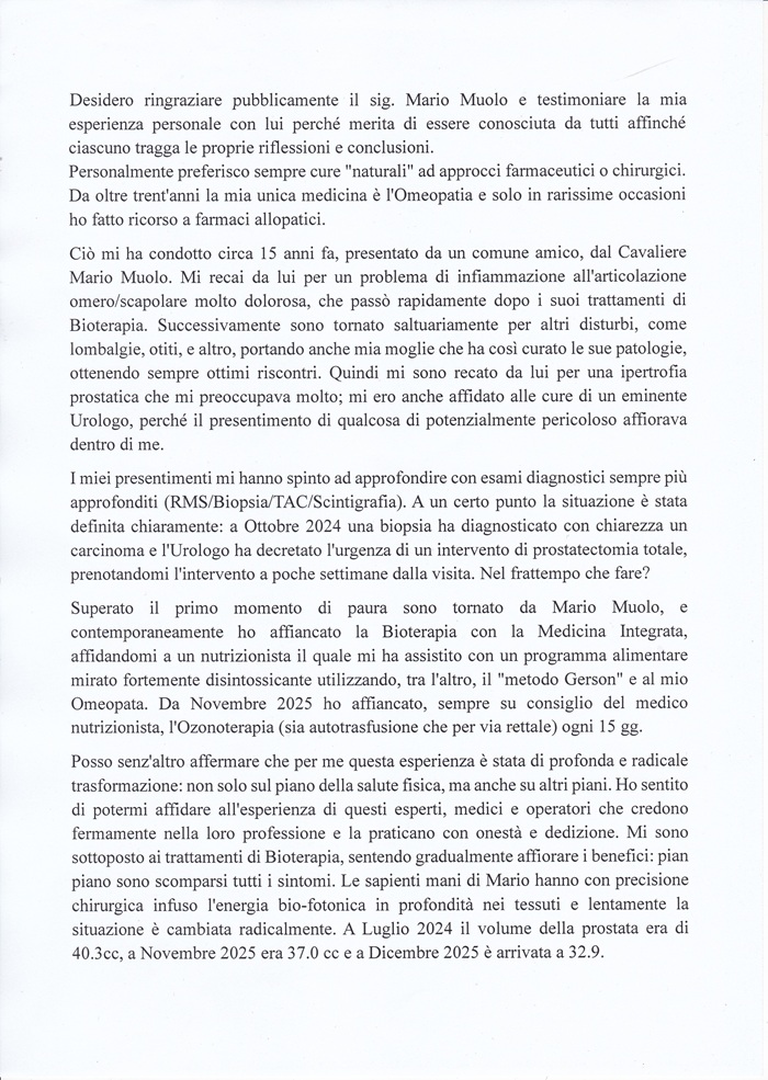 Posso senz'altro affermare che per me questa esperienza è stata di profonda e radicale trasformazione: non solo sul piano della salute fisica, ma anche su altri piani. Ho sentito di potermi affidare all'esperienza di questi esperti, medici e operatori che credono fermamente nella loro professione e la praticano con onestà e dedizione. Mi sono sottoposto ai trattamenti di Bioterapia, sentendo gradualmente affiorare i benefici: pian piano sono scomparsi tutti i sintomi. Le sapienti mani di Mario hanno con precisione chirurgica infuso l'energia bio-fotonica in profondità nei tessuti e lentamente la situazione è cambiata radicalmente. A Luglio 2024 il volume della prostata era di 40.3cc, a Novembre 2025 era 37.0 cc e a Dicembre 2025 è arrivata a 32.9.