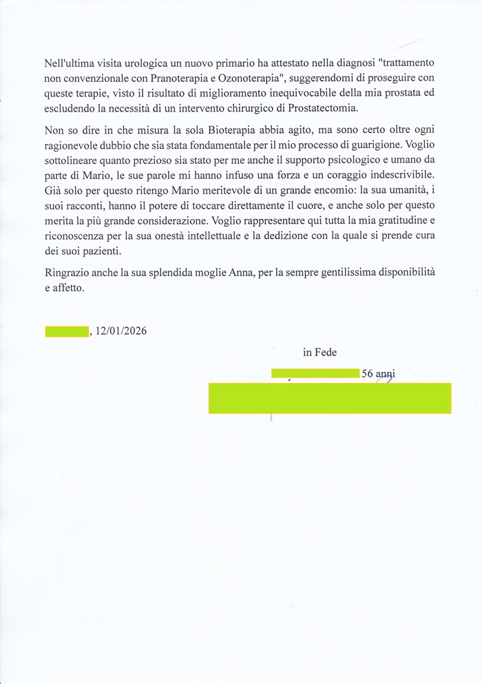 Nell'ultima visita urologica un nuovo primario ha attestato nella diagnosi "trattamento non convenzionale con Pranoterapia e Ozonoterapia", suggerendomi di proseguire con queste terapie, visto il risultato di miglioramento inequivocabile della mia prostata ed escludendo la necessità di un intervento chirurgico di Prostatectomia.