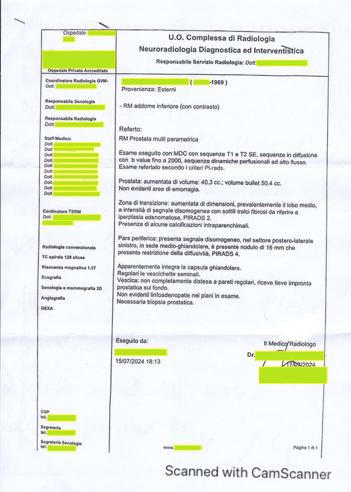 I miei presentimenti mi hanno spinto ad approfondire con esami diagnostici sempre più approfonditi (RMS/Biopsia/TAC/Scintigrafia). A un certo punto la situazione è stata definita chiaramente: a Ottobre 2024 una biopsia ha diagnosticato con chiarezza un carcinoma e l'Urologo ha decretato l'urgenza di un intervento di prostatectomia totale, prenotandomi l'intervento a poche settimane dalla visita. Nel frattempo che fare?