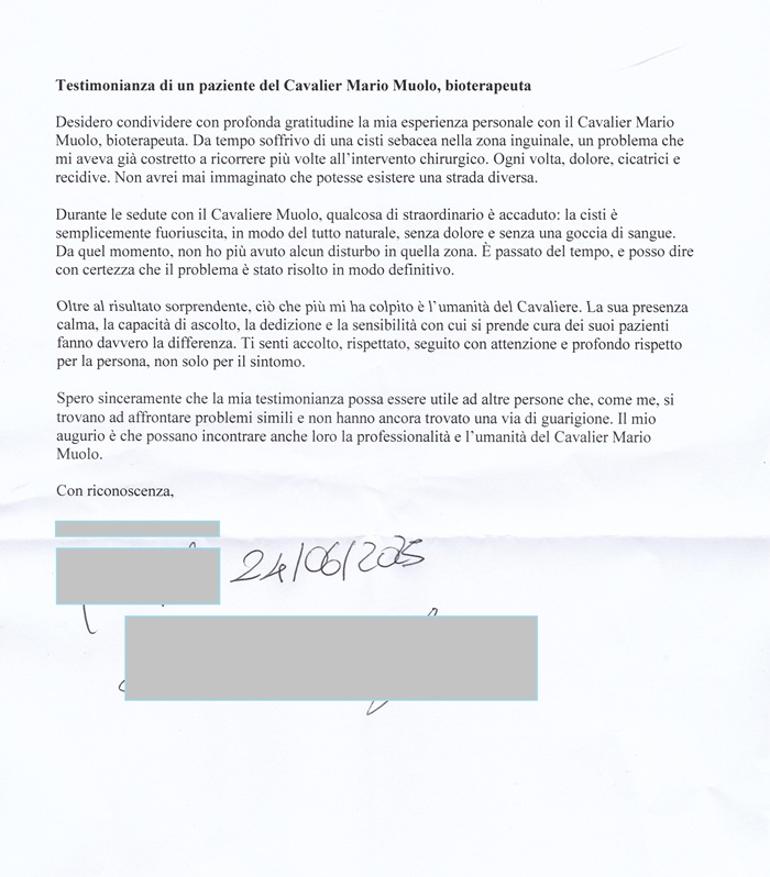 Ciò mi ha condotto circa 15 anni fa, presentato da un comune amico, dal Cavaliere Mario Muolo. Mi recai da lui per un problema di infiammazione all'articolazione omero/scapolare molto dolorosa, che passò rapidamente dopo i suoi trattamenti di Bioterapia. Successivamente sono tornato saltuariamente per altri disturbi, come lombalgie, otiti, e altro, portando anche mia moglie che ha così curato le sue patologie, ottenendo sempre ottimi riscontri. Quindi mi sono recato da lui per una ipertrofia prostatica che mi preoccupava molto; mi ero anche affidato alle cure di un eminente Urologo, perché il presentimento di qualcosa di potenzialmente pericoloso affiorava dentro di me.