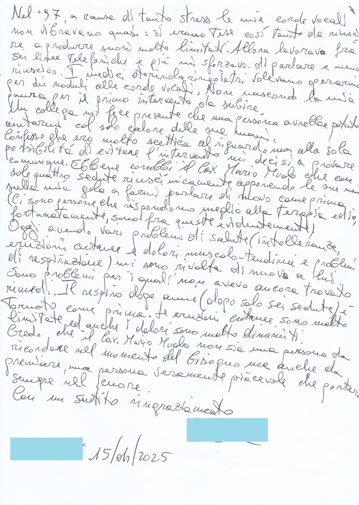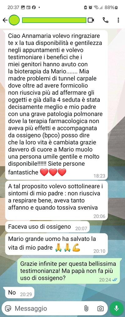 Non so dire in che misura la sola Bioterapia abbia agito, ma sono certo oltre ogni ragionevole dubbio che sia stata fondamentale per il mio processo di guarigione. Voglio sottolineare quanto prezioso sia stato per me anche il supporto psicologico e umano da parte di Mario, le sue parole mi hanno infuso una forza e un coraggio indescrivibile. Già solo per questo ritengo Mario meritevole di un grande encomio: la sua umanità, i suoi racconti, hanno il potere di toccare direttamente il cuore, e anche solo per questo merita la più grande considerazione. Voglio rappresentare qui tutta la mia gratitudine e riconoscenza per la sua onestà intellettuale e la dedizione con la quale si prende cura dei suoi pazienti.