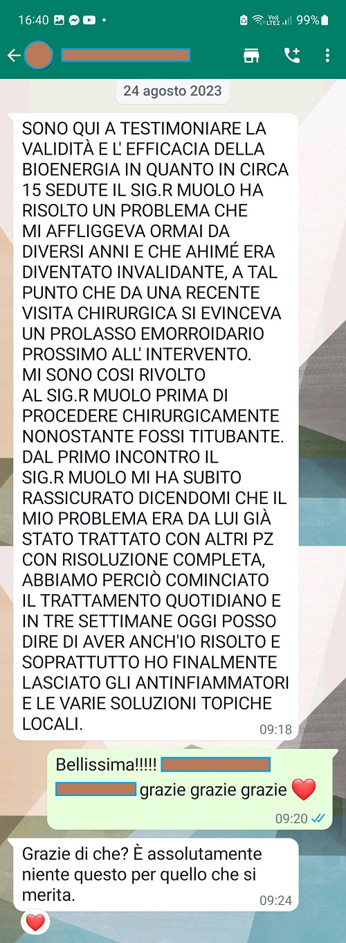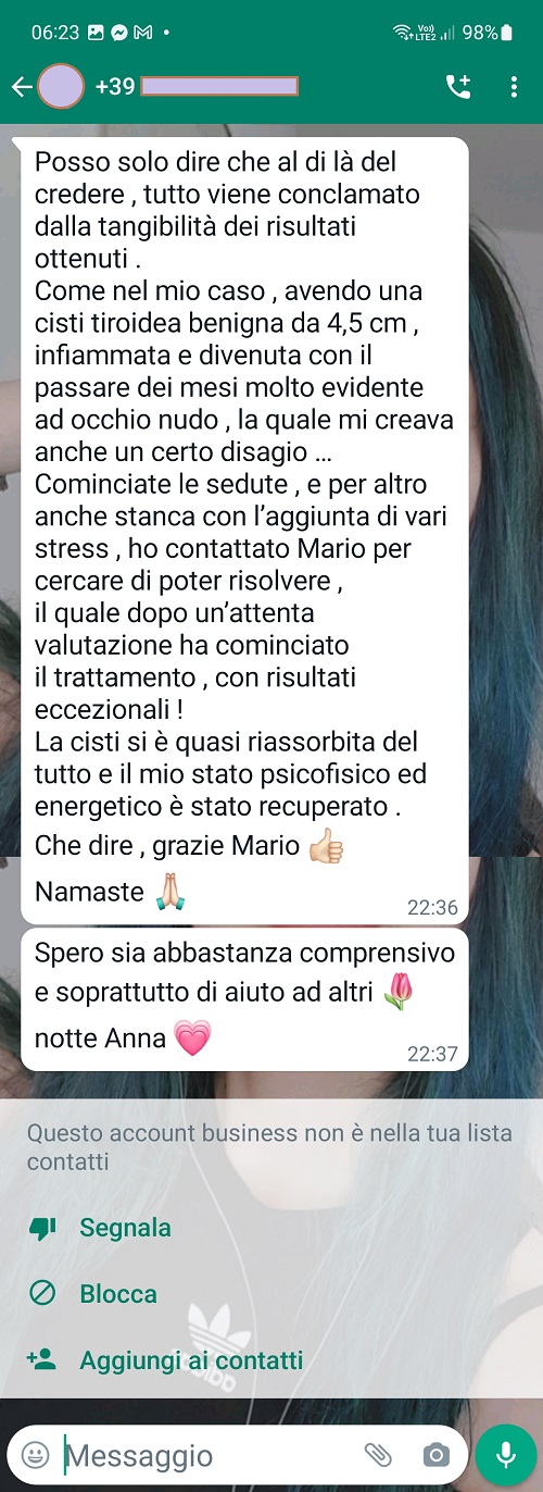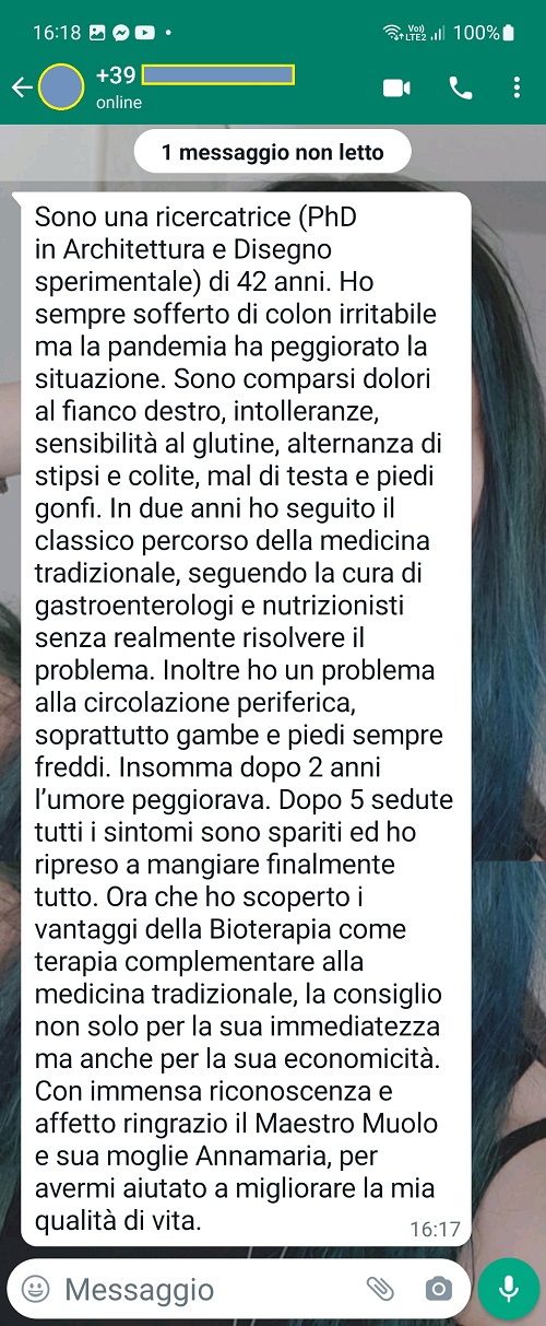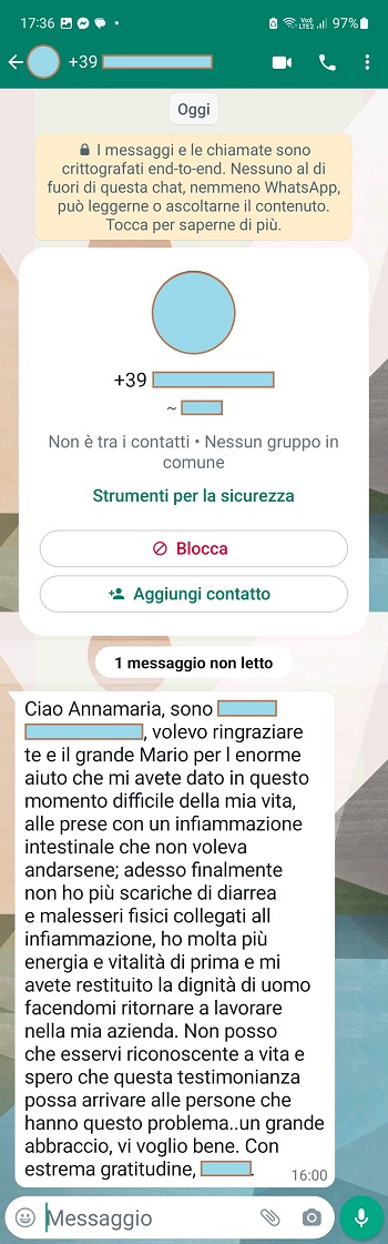 Ciao Annamaria, sono ... ... , volevo ringraziare te e il grande Mario per l'enorme aiuto che mi avete dato in questo momento difficile della mia vita, alle prese con un infiammazione intestinale che non voleva andarsene; adesso finalmente non ho più scariche di diarrea e malesseri fisici collegati all'infiammazione, ho molta più energia e vitalità di prima e mi avete restituito la dignità di uomo facendomi ritornare a lavorare nella mia azienda. Non posso che esservi riconoscente a vita e spero che questa testimonianza possa arrivare alle persone che hanno questo problema...un grande abbraccio, vi voglio bene. Con estrema gratitudine … ….