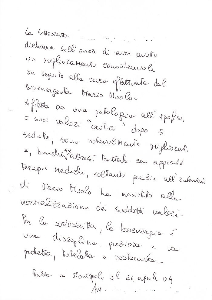 Poi qualcuno mi fece il nome di Mario Muolo. Così, presa dalla disperazione ma anche dalla speranza di guarire dal mio male oscuro e con la certezza che non propinava alcun medicinale verso i quali provavo e provo una certa diffidenza e riluttanza, formai una piccola comitiva e andammo a trovarlo.