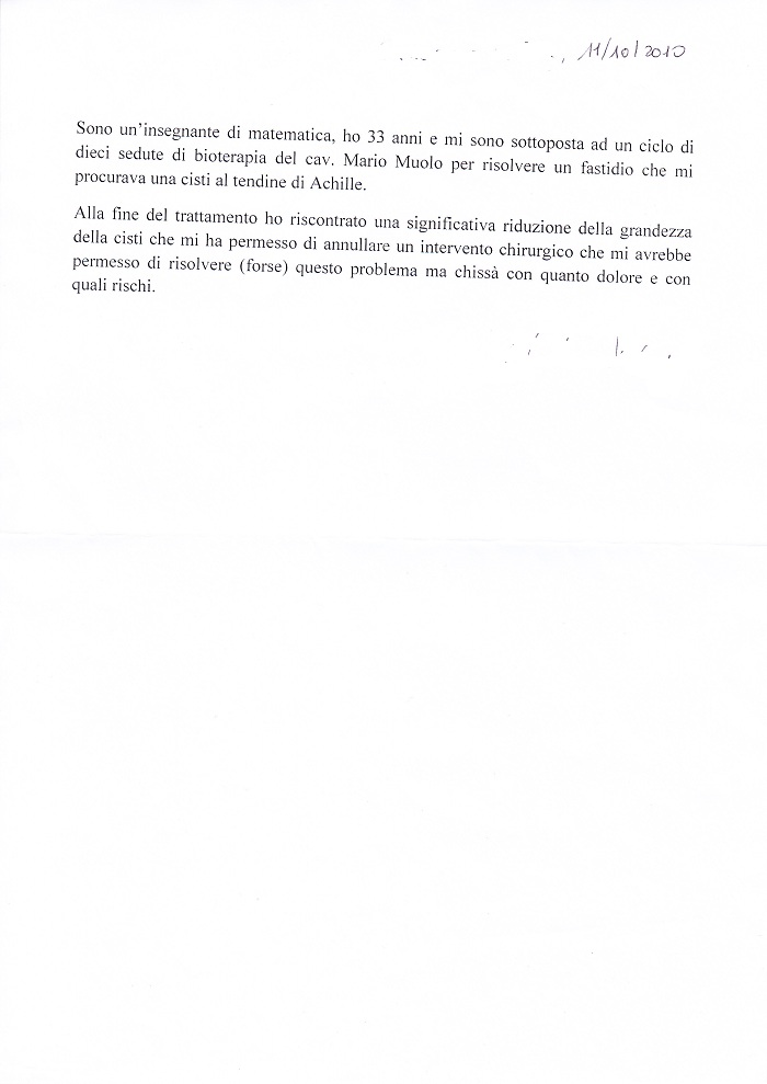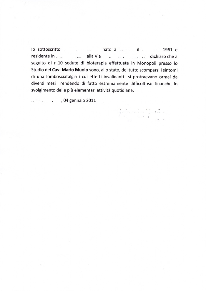 di aver sofferto di CRISI VERTIGINOSE per un intero mese e di averle risolte in seguito ad un ciclo di BIOTERAPIA effettuato dal CAV. MARIO MUOLO.