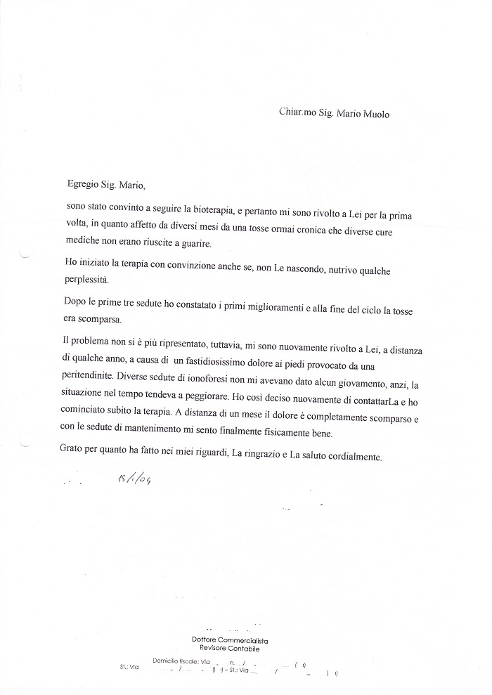 sono stato convinto a seguire la bioterapia, e pertanto mi sono rivolto a Lei per la prima volta, in quanto affetto da diversi mesi da una tosse ormai cronica che diverse cure mediche non erano riuscite a guarire.