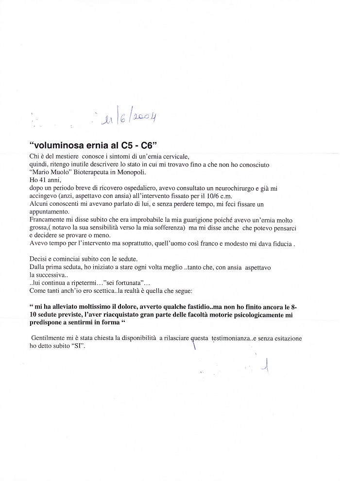 Il Sig. Muolo, avuta la conferma della esattezza della diagnosi, affermò di essere in grado di fornirmi un aiuto terapeutico. Premetto che inizialmente ero molto scettica; mi rassicurai quando cominciai ad avvertire un senso di sollievo e soprattutto, a seguito di controlli effettuati presso sedi specialistiche ospedaliere (ecografie, analisi), emerse che la disfunzione era sparita.