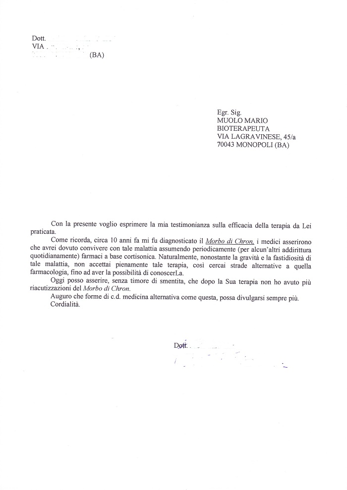 Ancora oggi mi rivolgo al Sig. Muolo per tenere sotto controllo la malattia.: ho sperimentato l'efficacia del suo metodo, che mi consente di non far ricorso a farmaci tradizionali, che, a base di iodio, al quale sono allergica, non posso assumere senza attente e particolari precauzioni.