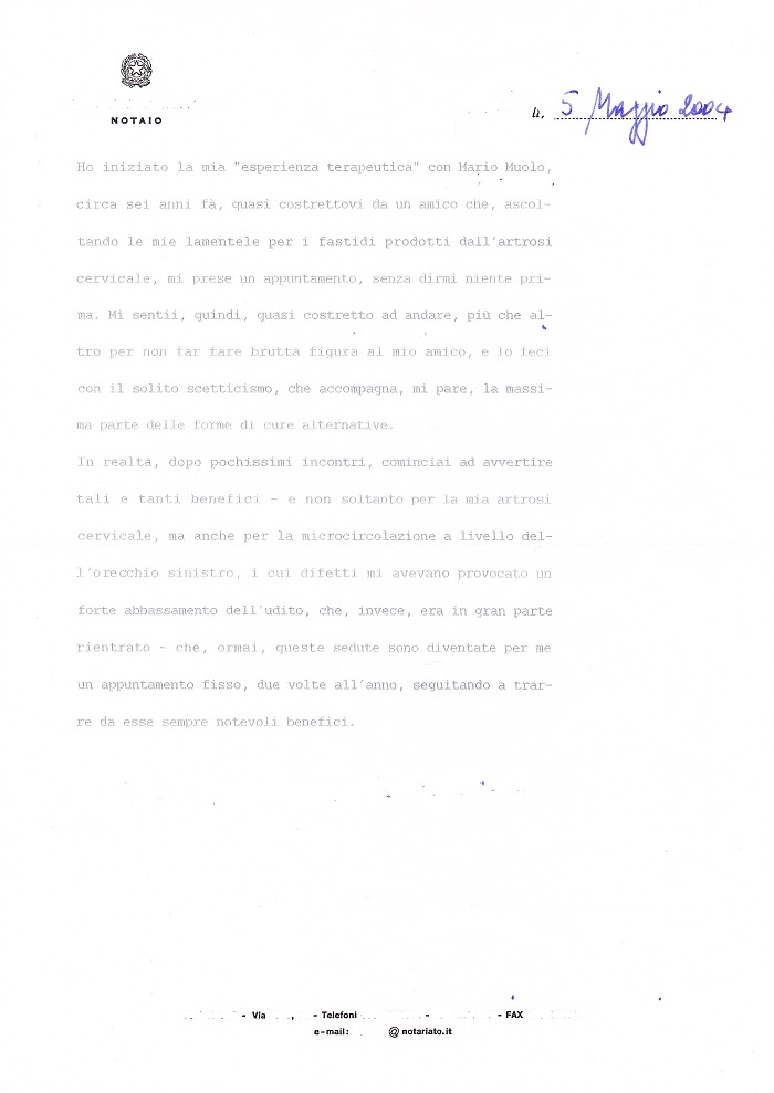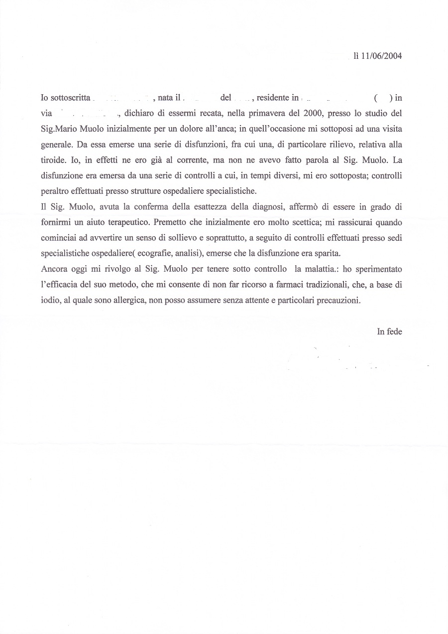 Io sottoscritta ... , nata il ... del ... , residente in ... ... via ... ... , dichiaro di essermi recata, nella primavera del 2000, presso lo studio del Sig.Mario Muolo inizialmente per un dolore all'anca; in quell'occasione mi sottoposi ad una visita generale. Da essa emerse una serie di disfunzioni, fra cui una, di particolare rilievo, relativa alla tiroide. lo, in effetti ne ero già al corrente, ma non ne avevo fatto parola al Sig. Muolo. La disfunzione era emersa da una serie di controlli a cui, in tempi diversi, mi ero sottoposta; controlli peraltro effettuati presso strutture ospedaliere specialistiche.
