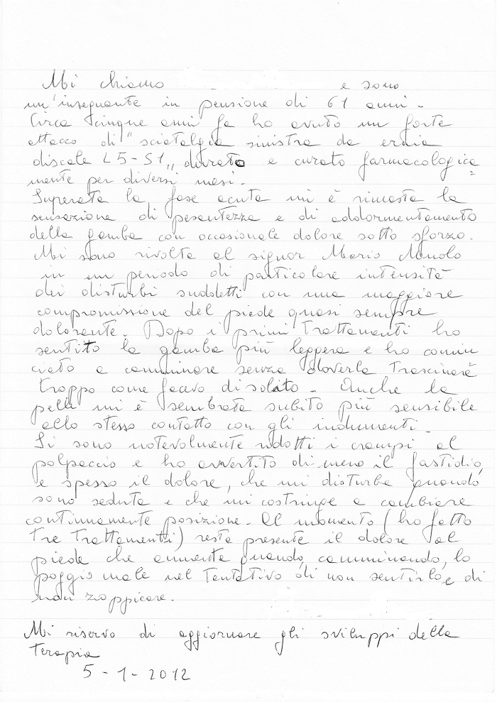 Mi chiamo … … … e sono un’insegnante in pensione di 61 anni. Circa cinque anni fa ho avuto un forte attacco di “sciatalgia sinistra da ernia discale L5-S1” durato e curato farmacologicamente per diversi mesi.