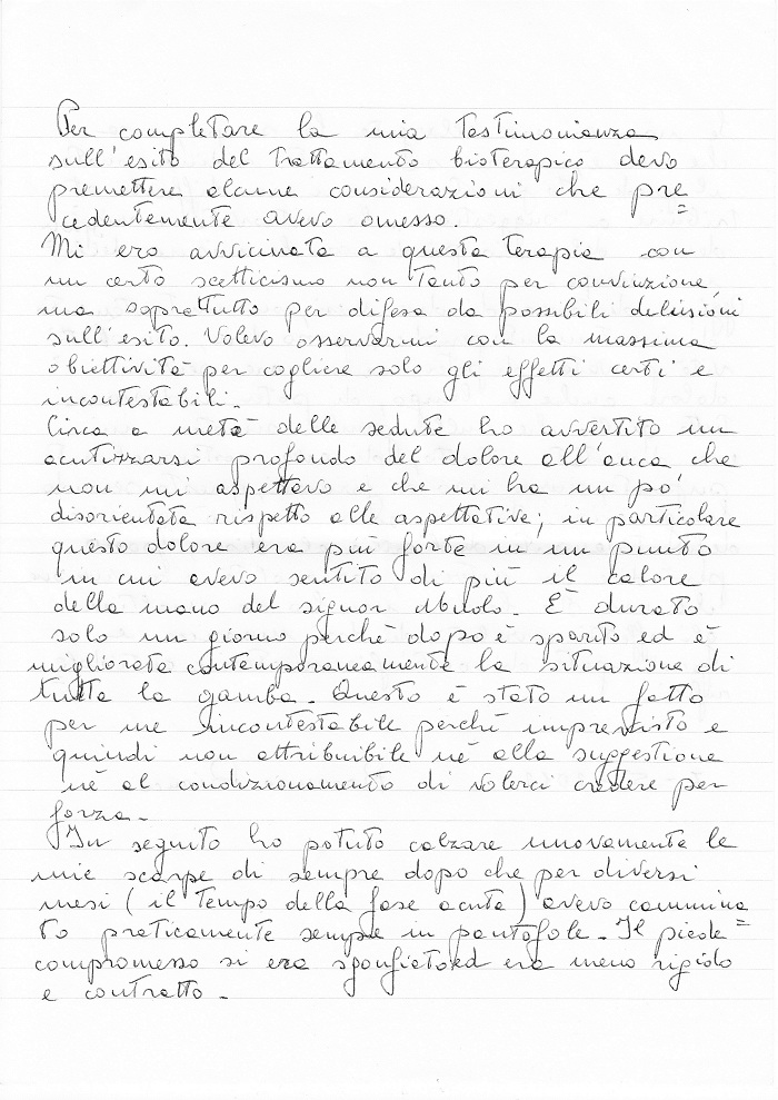 Per completare la mia testimonianza sull’esito del trattamento bioterapico devo premettere alcune considerazioni che precedentemente avevo omesso.