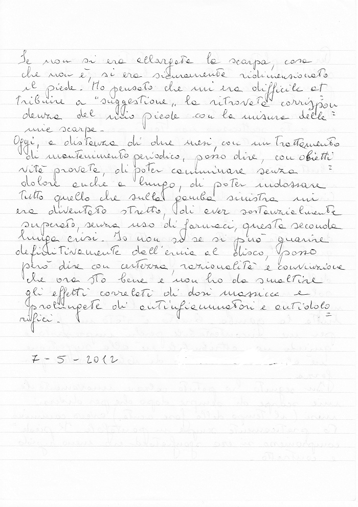 Oggi, a distanza di due mesi, con un trattamento di mantenimento periodico, posso dire, con obiettività provata, di poter camminare senza dolore anche a lungo, di poter indossare tutto quello che sulla gamba sinistra mi era diventato stretto, di aver sostanzialmente superato, senza uso di farmaci, questa seconda lunga crisi. Io non so se si può guarire definitivamente dall’ernia al disco, posso però dire con certezza, razionalità e convinzione che ora sto bene e non ho da smaltire gli effetti correlati di dosi massicce e prolungate di antinfiammatori e antidolorifici.