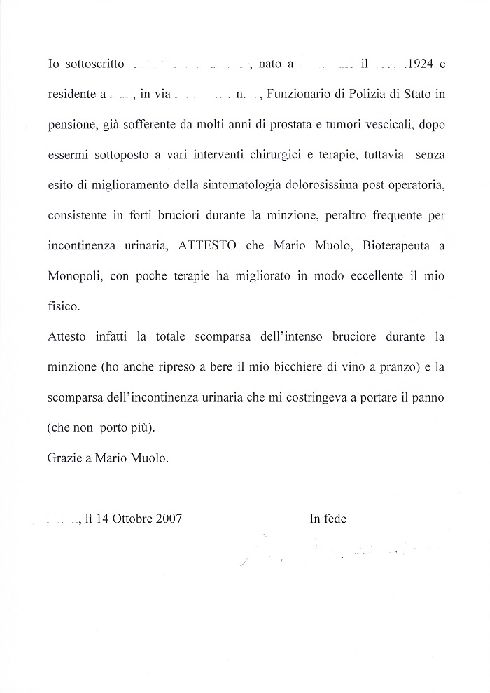 Mi sono rivolta al signor. Mario Muolo in un periodo di particolare intensità dei disturbi suddetti con una maggiore compromissione del piede quasi sempre dolorante. Dopo i primi trattamenti ho sentito la gamba più leggera e ho cominciato a camminare senza doverla trascinare troppo come facevo di solito. Anche la pelle mi è sembrata subito più sensibile allo stesso contatto con gli indumenti.