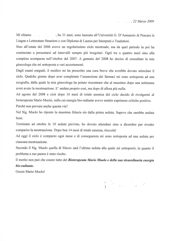 Circa a metà delle sedute ho avvertito un acutizzarsi profondo del dolore all’anca che non mi aspettavo e che mi ha un po’ disorientata rispetto alle aspettative; in particolare questo dolore era più forte in un punto in cui avevo sentito di più il calore della mano del signor Muolo. È durato solo un giorno perché dopo è sparito ed è migliorata contemporaneamente la situazione di tutta la gamba. Questo è stato un fatto per me incontestabile perché imprevisto e quindi non attribuibile né alla suggestione né al condizionamento di volerci credere per forza.